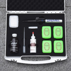Starten Sie mit dem FOS Starterkoffer. Er beinhaltet Oberkiefer- und Unterkieferschienen, Unterfütterungsmaterial, Fräse und Patientenboxen.